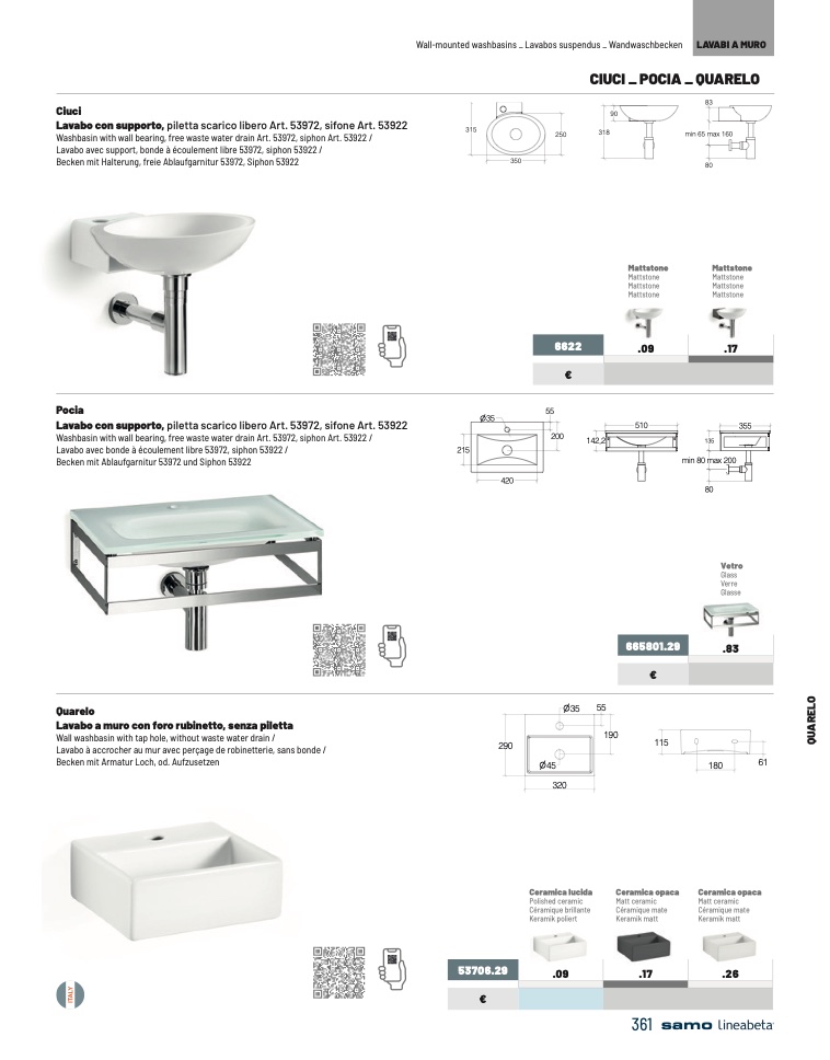 Lavabo con supporto, piletta scarico libero Art. 53972, sifone Art. 53922