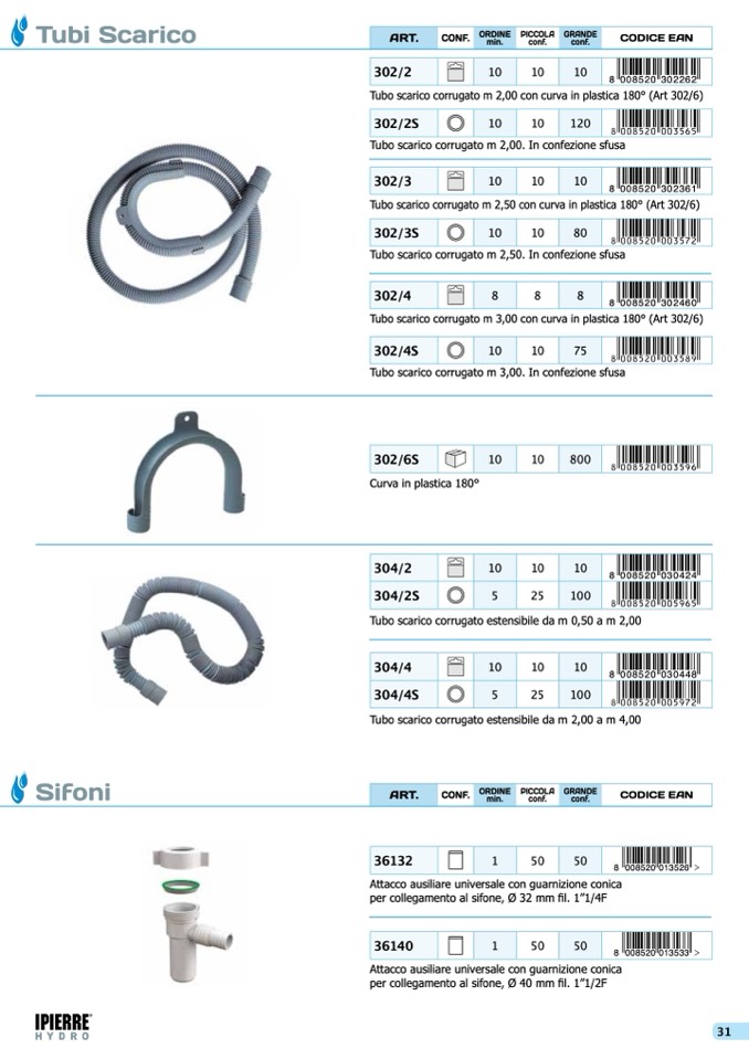 Tubo scarico corrugato m 3,00 con curva in plastica 180° (Art 302/6)