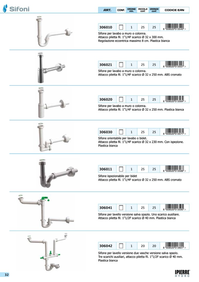 Attacco piletta fil. 1”1/4F scarico Ø 32 x 230 mm. Con ispezione.