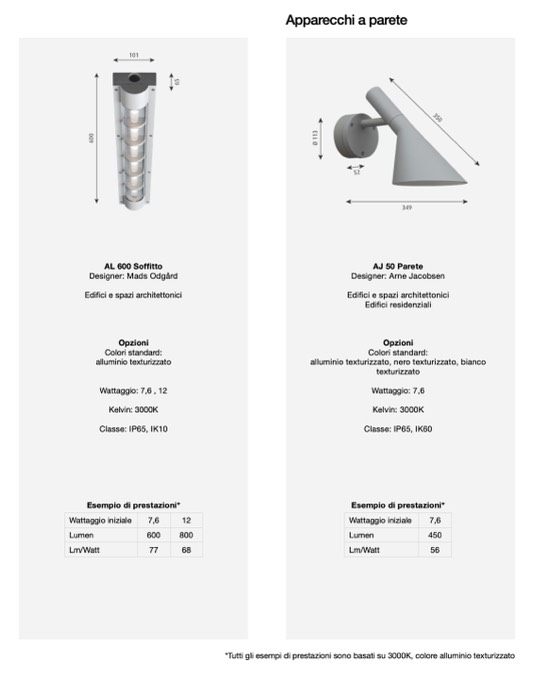 *Tutti gli esempi di prestazioni sono basati su 3000K, colore alluminio texturizzato