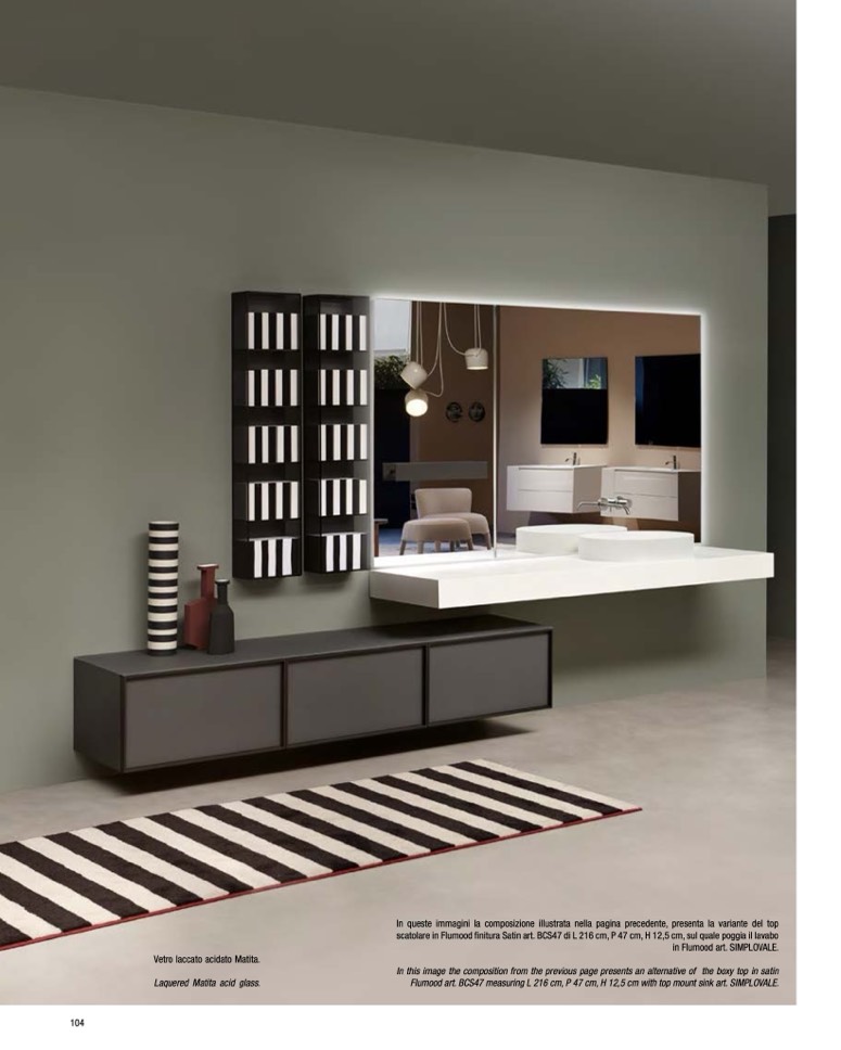 Flumood art. BCS47 measuring L 216 cm, P 47 cm, H 12,5 cm with top mount sink art. SIMPLOVALE.