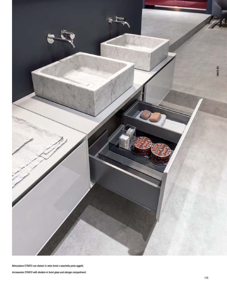 Attrezzature STRATO con divisori in vetro fumè e vaschetta porta oggetti.