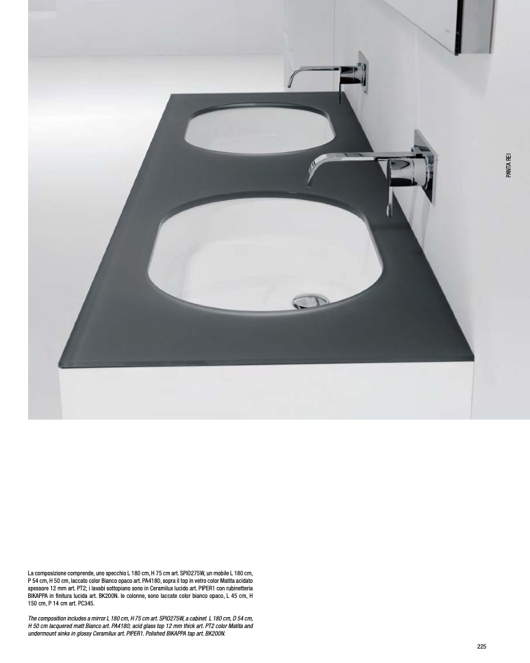 spessore 12 mm art. PT2; i lavabi sottopiano sono in Ceramilux lucido art. PIPER1 con rubinetteria