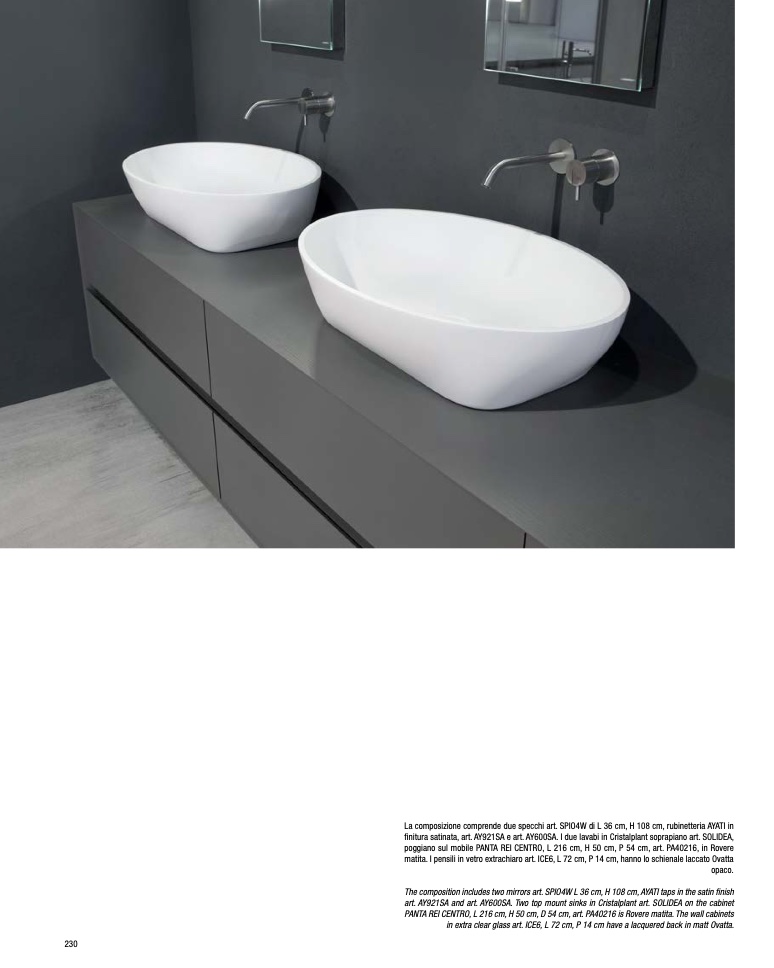 finitura satinata, art. AY921SA e art. AY600SA. I due lavabi in Cristalplant soprapiano art. SOLIDEA,