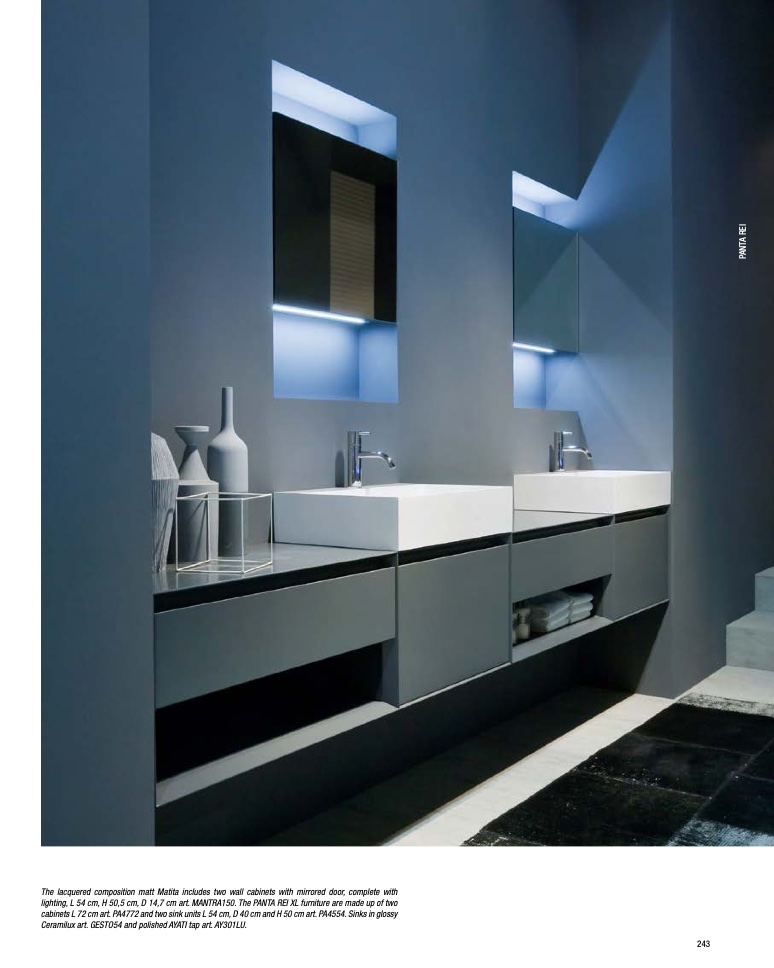 cabinets L 72 cm art. PA4772 and two sink units L 54 cm, D 40 cm and H 50 cm art. PA4554. Sinks in glossy