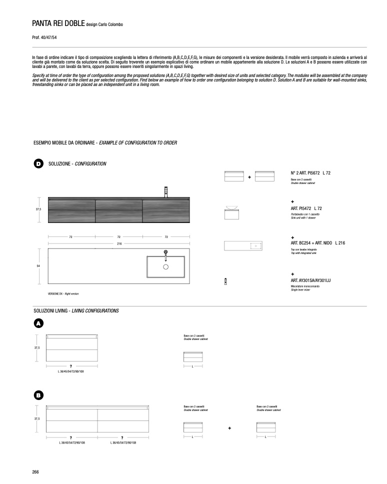 In fase di ordine indicare il tipo di composizione scegliendo la lettera di riferimento (A,B,C,D,E,F,G), le misure dei componenti e la versione desiderata. Il mobile verrà composto in azienda e arriverà al