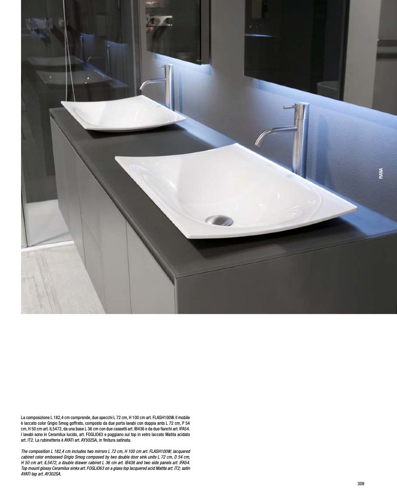 I lavabi sono in Ceramilux lucido, art. FOGLIO63 e poggiano sul top in vetro laccato Matita acidato