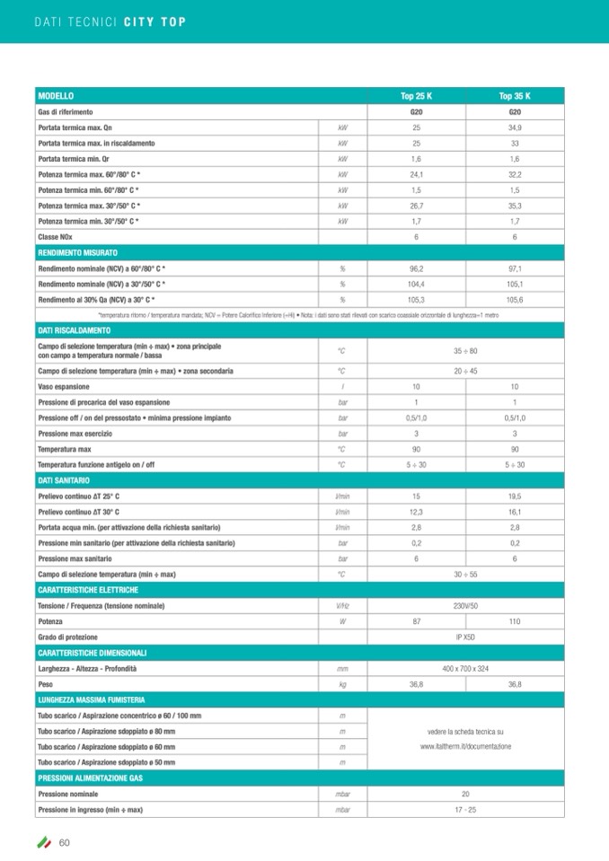 *temperatura ritorno / temperatura mandata; NCV = Potere Calorifico Inferiore (=Hi) • Nota: i dati sono stati rilevati con scarico coassiale orizzontale di lunghezza=1 metro
