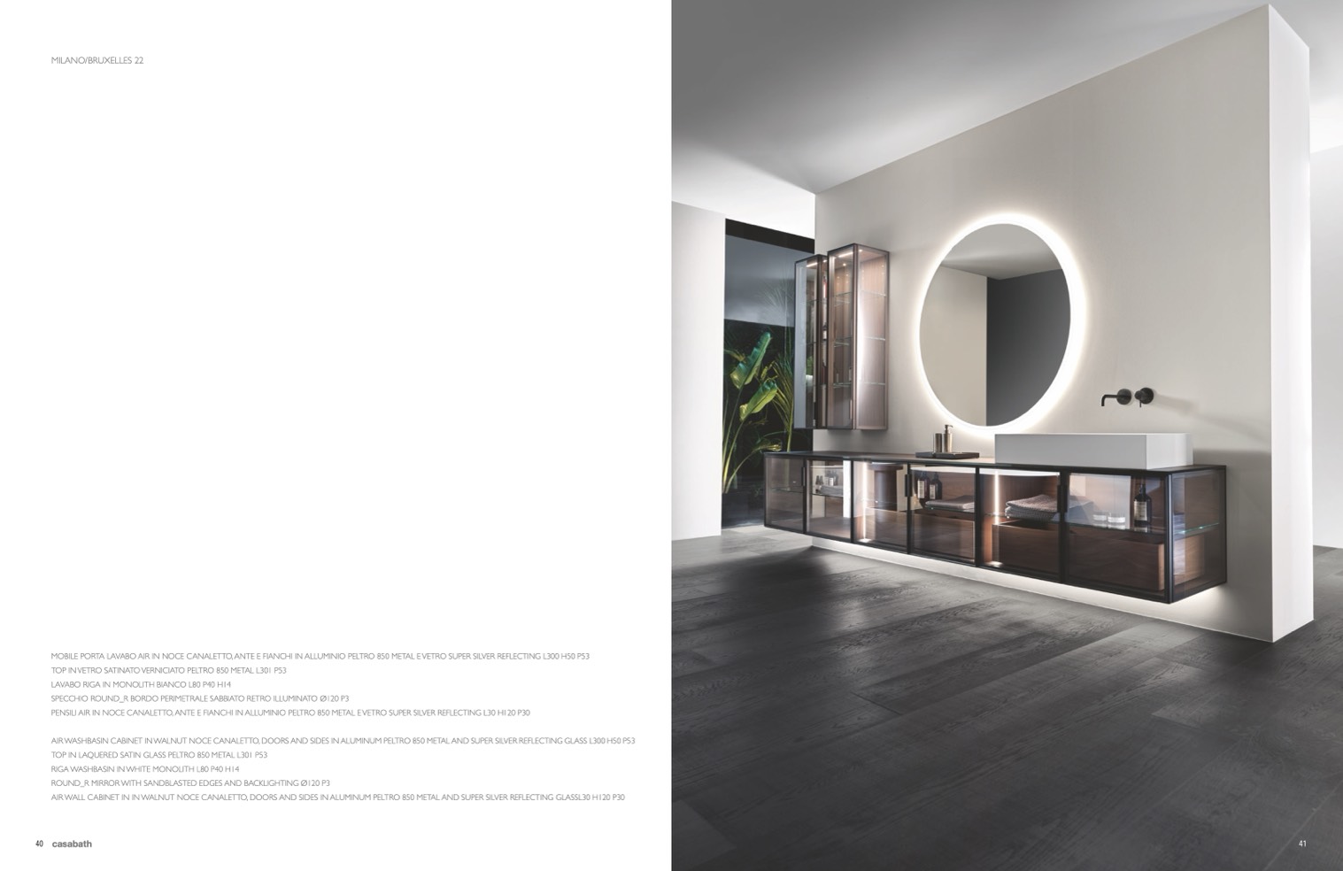 AIR WASHBASIN CABINET IN WALNUT NOCE CANALETTO, DOORS AND SIDES IN ALUMINUM PELTRO 850 METAL AND SUPER SILVER REFLECTING GLASS L300 H50 P53