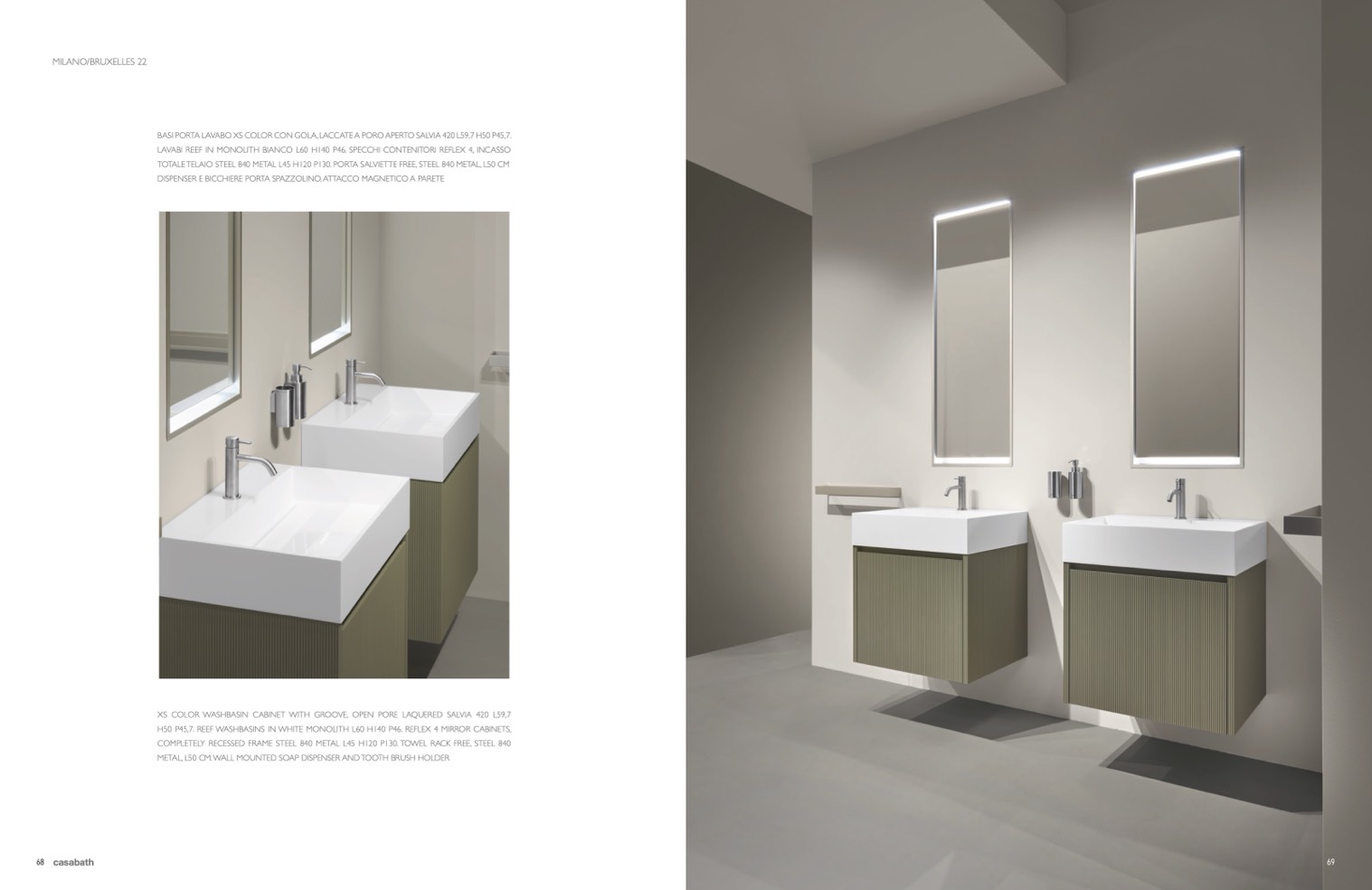 H50 P45,7. REEF WASHBASINS IN WHITE MONOLITH L60 H140 P46. REFLEX 4 MIRROR CABINETS,