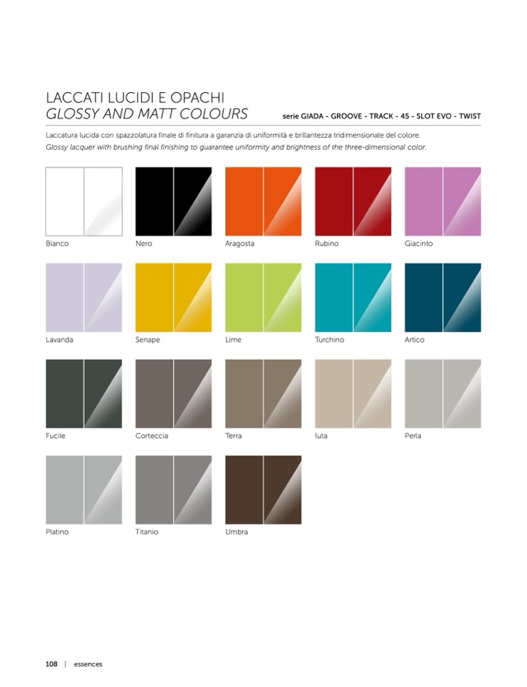Laccatura lucida con spazzolatura finale di finitura a garanzia di uniformità e brillantezza tridimensionale del colore.