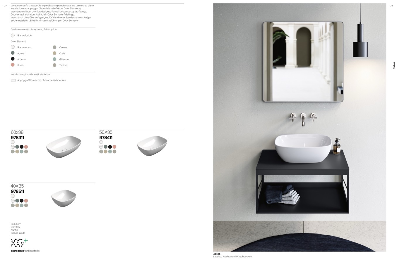 Lavabo senza foro troppopieno predisposto per rubinetteria a parete o su piano.