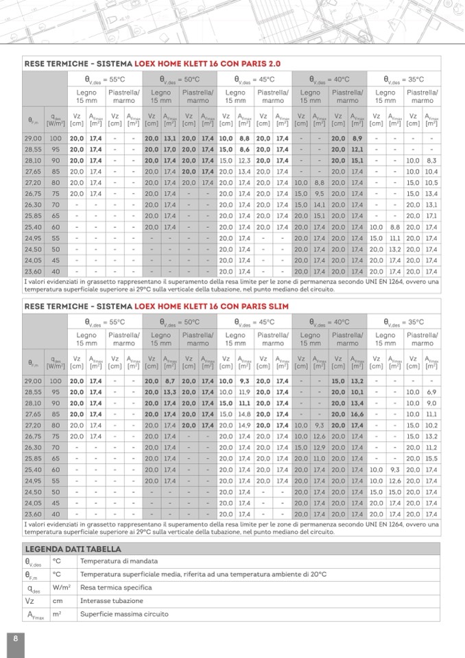 I valori evidenziati in grassetto rappresentano il superamento della resa limite per le zone di permanenza secondo UNI EN 1264, ovvero una