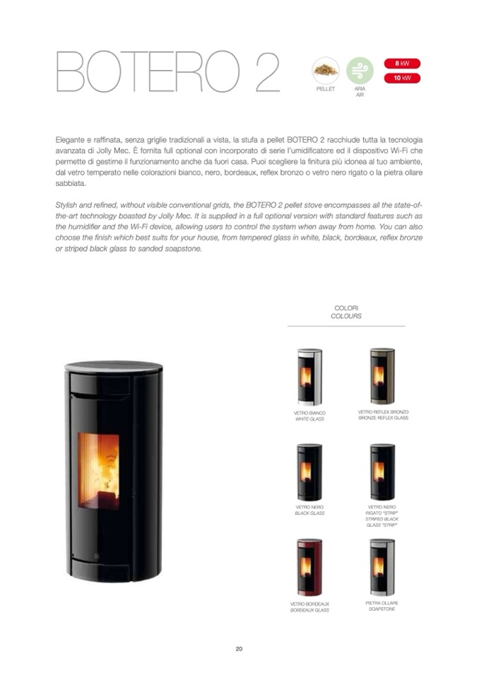 Elegante e raffinata, senza griglie tradizionali a vista, la stufa a pellet BOTERO 2 racchiude tutta la tecnologia