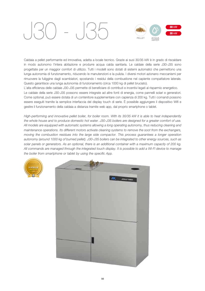 autonomy (around 1000 kg of burned pellet). J30-J35 boilers can be integrated to other energy sources, such as