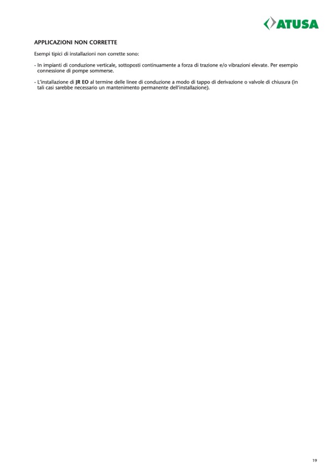- L’installazione di JR EO al termine delle linee di conduzione a modo di tappo di derivazione o valvole di chiusura (in