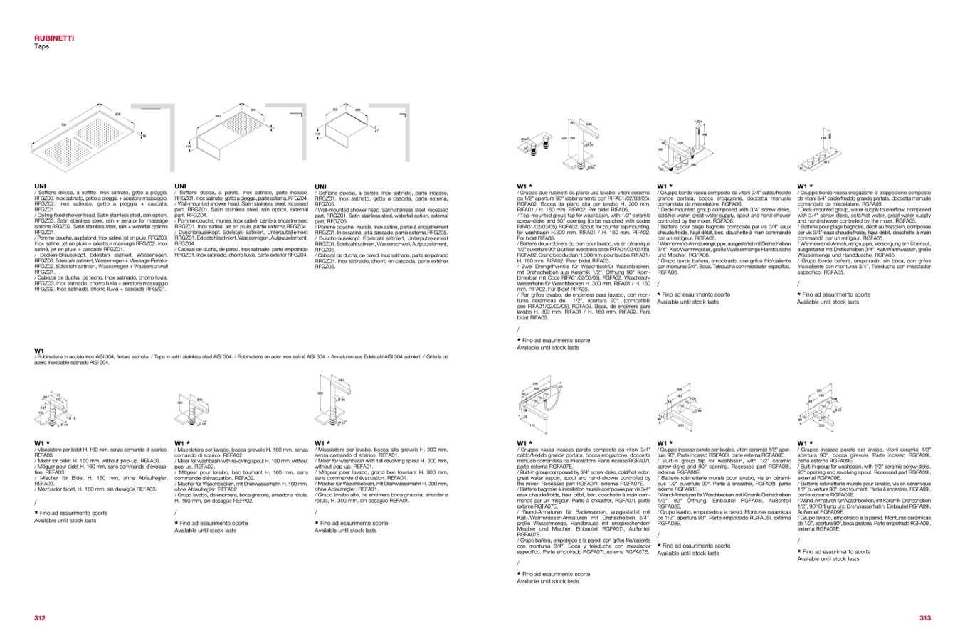 / Rubinetteria in acciaio inox AISI 304, finitura satinata. / Taps in satin stainless steel AISI 304. / Robinetterie en acier inox satiné AISI 304. / Armaturen aus Edelstahl AISI 304 satiniert. / Grifería de