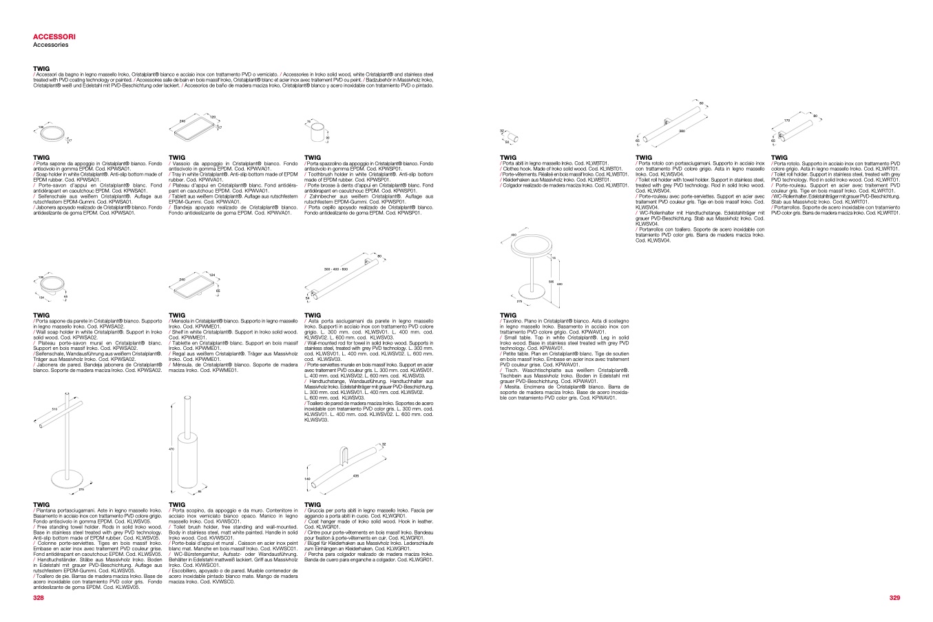 treated with PVD coating technology or painted. / Accessoires salle de bain en bois massif Iroko, Cristalplant® blanc et acier inox avec traitement PVD ou peint. / Badzubehör in Massivholz Iroko,
