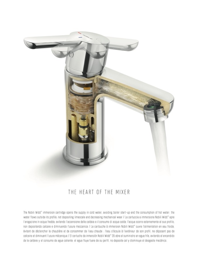 water flows outside its profile, not depositing limescale and decreasing mechanical wear / La cartuccia a immersione Nobili Widd