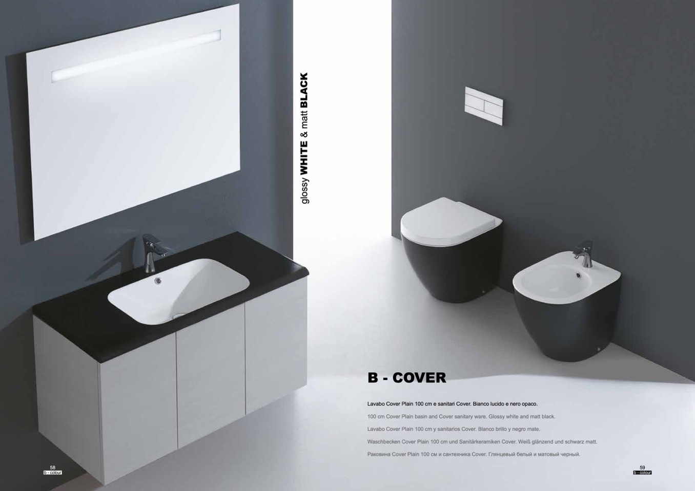 Lavabo Cover Plain 100 cm e sanitari Cover. Bianco lucido e nero opaco.
