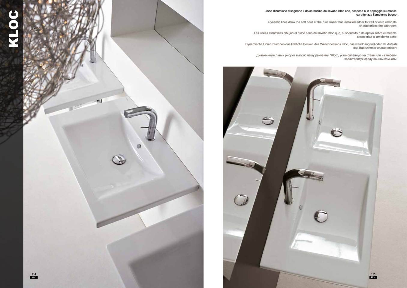 Linee dinamiche disegnano il dolce bacino del lavabo Kloc che, sospeso o in appoggio su mobile,