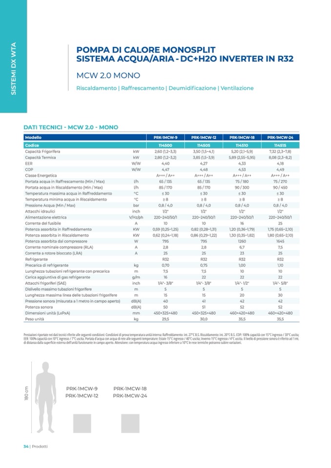 EER: 100% capacità con 10°C ingresso / 7°C uscita. Portata d’acqua con acqua di rete alle seguenti temperature: Estate 15°C ingresso / 40°C uscita; Inverno 15°C ingresso / 4°C uscita. Il livello di pressione sonora