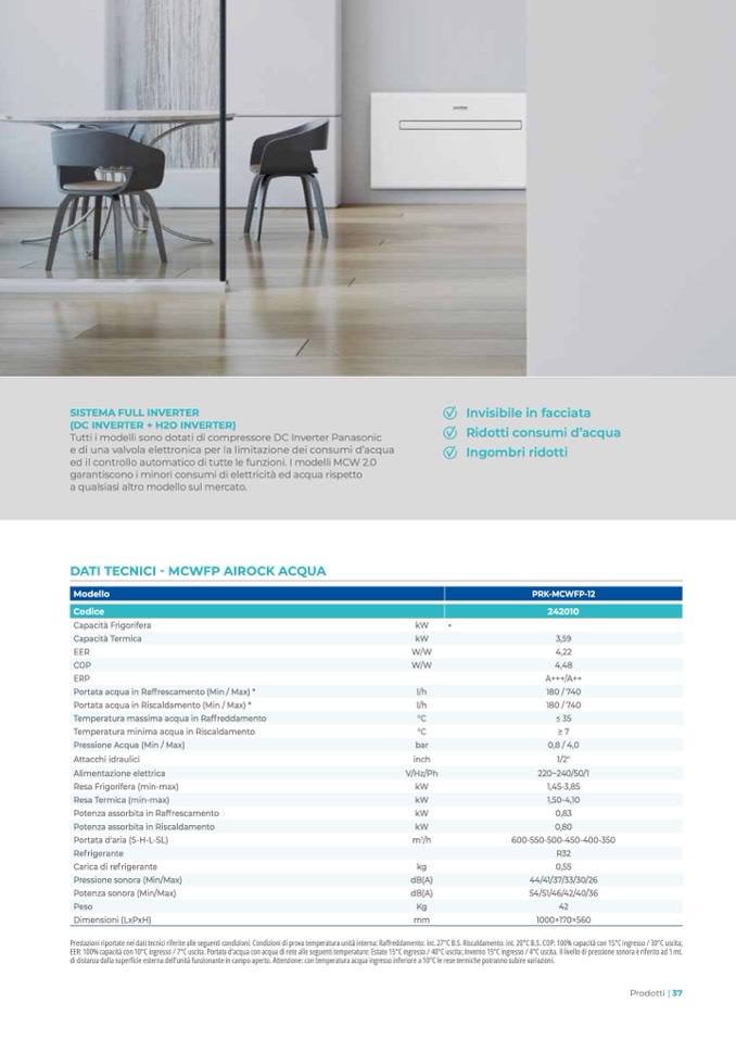 à con 10°C ingresso / 7°C uscita. Portata d’acqua con acqua di rete alle seguenti temperature: Estate 15°C ingresso / 40°C uscita; Inverno 15°C ingresso / 4°C uscita. Il livello di pressione sonora è riferito ad 1 mt.