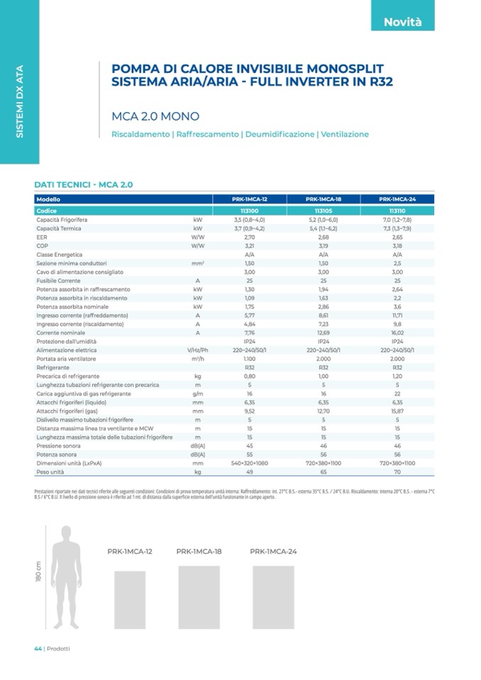 Prestazioni riportate nei dati tecnici riferite alle seguenti condizioni: Condizioni di prova temperatura unità interna: Raffreddamento: int. 27°C B.S.- esterna 35°C B.S. / 24°C B.U. Riscaldamento: interna 20°C B.S. - esterna 7°C