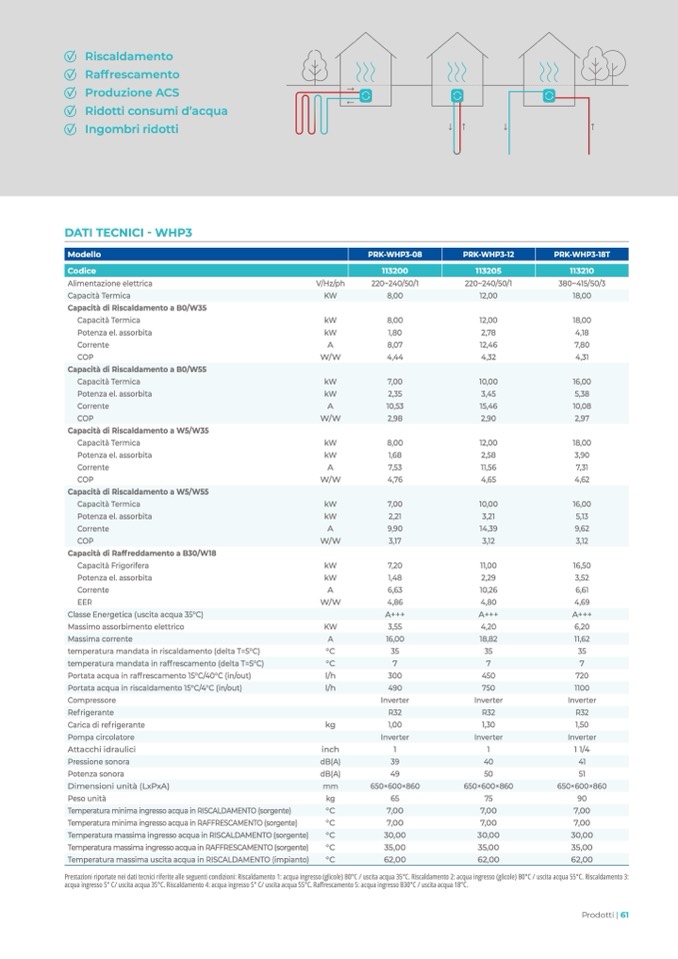 Prestazioni riportate nei dati tecnici riferite alle seguenti condizioni: Riscaldamento 1: acqua ingresso (glicole) B0°C / uscita acqua 35°C. Riscaldamento 2: acqua ingresso (glicole) B0°C / uscita acqua 55°C. Riscaldamento 3: