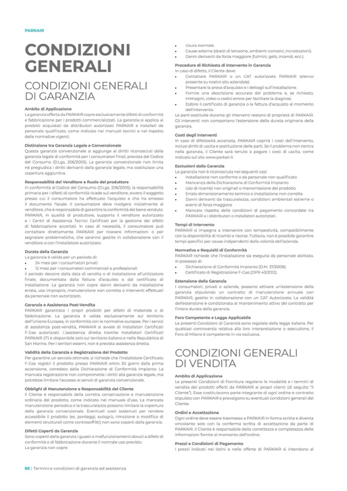 La garanzia offerta da PARKAIR copre esclusivamente difetti di conformit