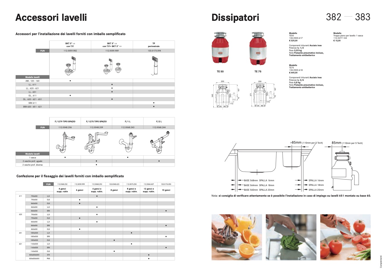 Accessori per l’installazione dei lavelli forniti con imballo semplificato