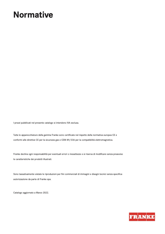 Tutte le apparecchiature della gamma Franke sono certificate nel rispetto della normativa europea CE e