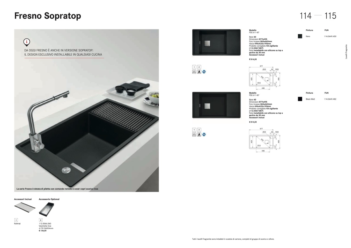Tutti i lavelli Fragranite sono imballati in scatola di cartone, completi di gruppo di scarico e sifone.