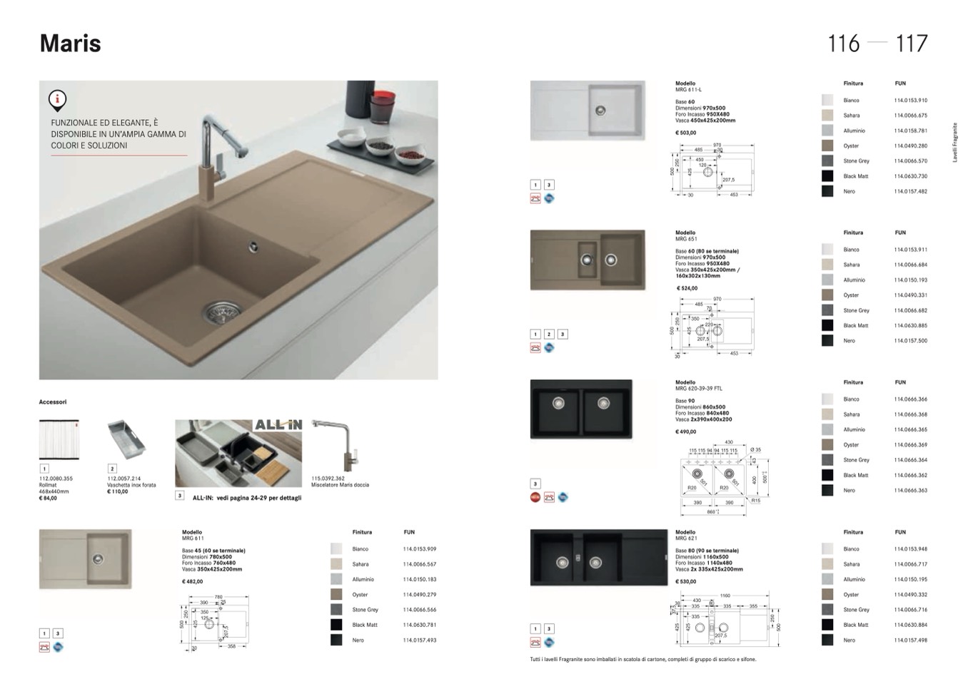 Tutti i lavelli Fragranite sono imballati in scatola di cartone, completi di gruppo di scarico e sifone.