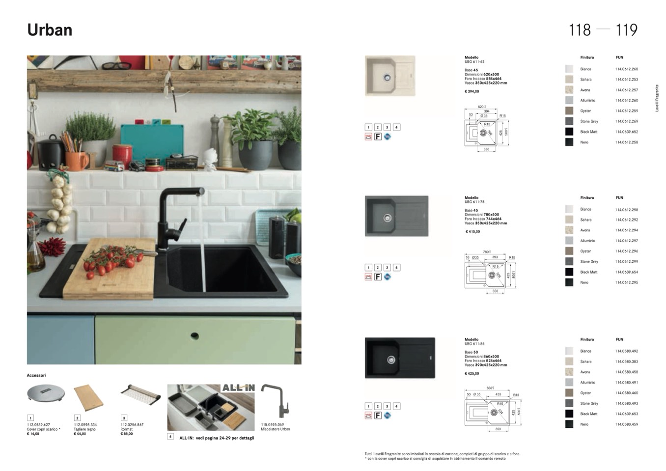 Tutti i lavelli Fragranite sono imballati in scatola di cartone, completi di gruppo di scarico e sifone.