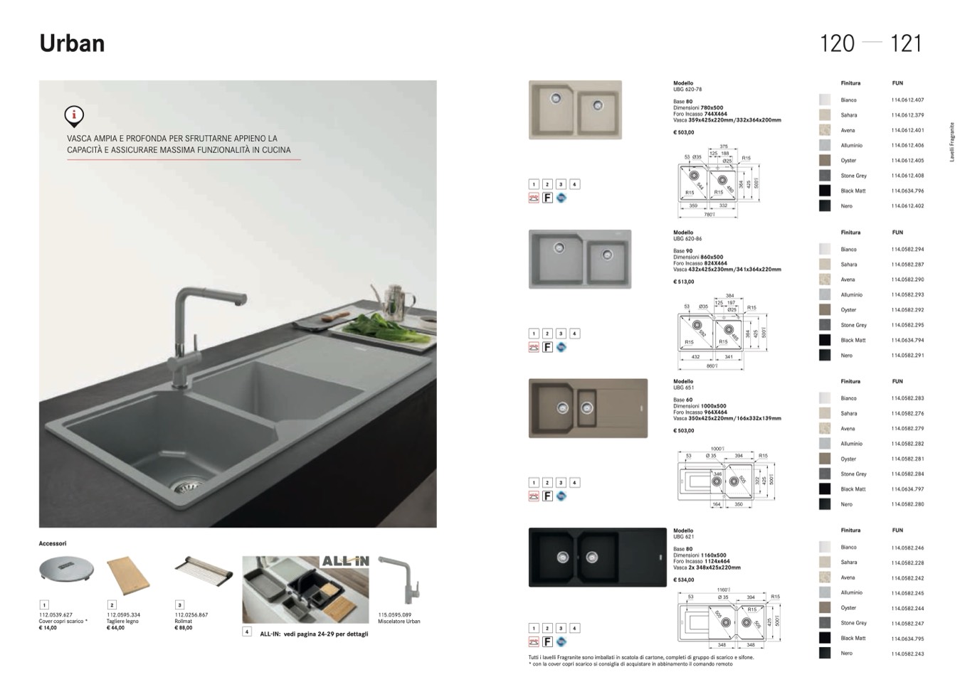 Tutti i lavelli Fragranite sono imballati in scatola di cartone, completi di gruppo di scarico e sifone.