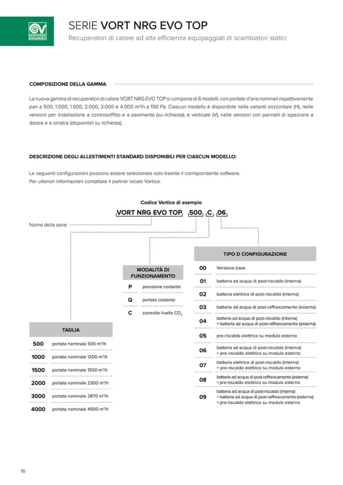 La nuova gamma di recuperatori di calore VORT NRG EVO TOP si compone di 6 modelli, con portate d’aria nominali rispettivamente