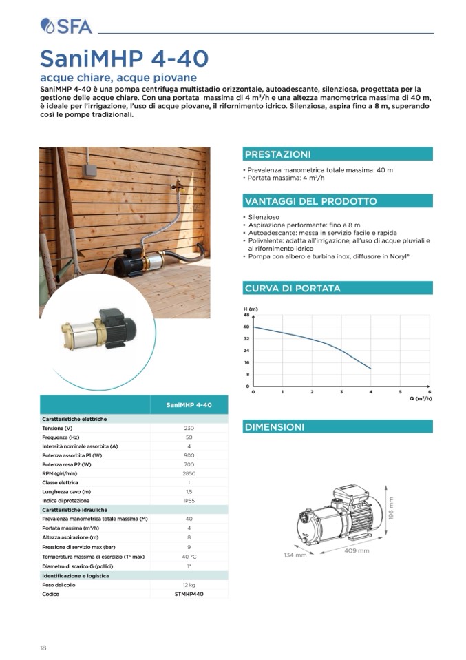 SaniMHP 4-40 è una pompa centrifuga multistadio orizzontale, autoadescante, silenziosa, progettata per la