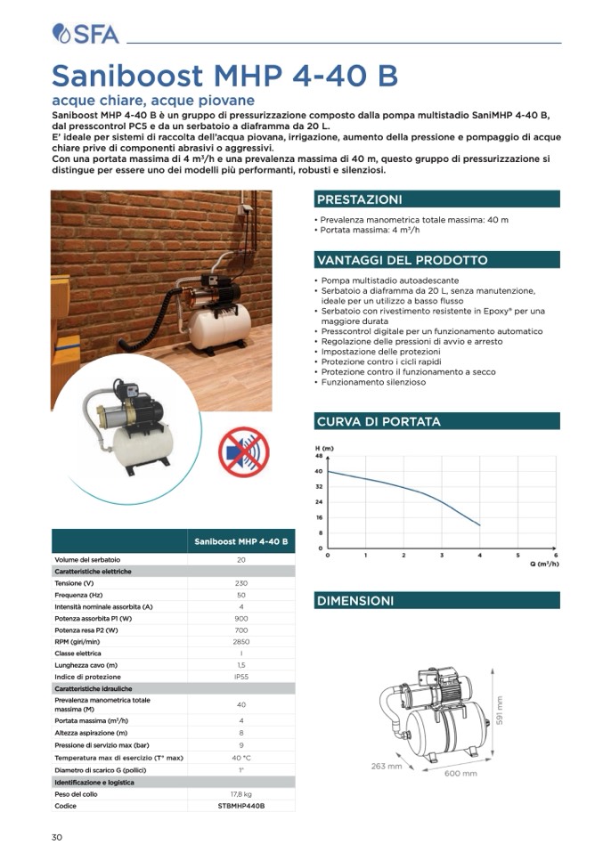 /h e una prevalenza massima di 40 m, questo gruppo di pressurizzazione si