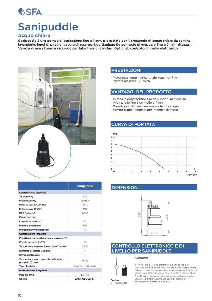 lavanderie, fondi di piscine, gabbie di ascensori, ec. Sanipuddle permette di evacuare fino a 7 m in altezza.
