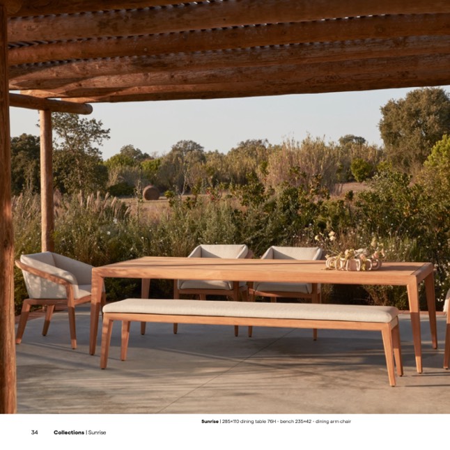 Sunrise | 285x110 dining table 76H - bench 235x42 - dining arm chair