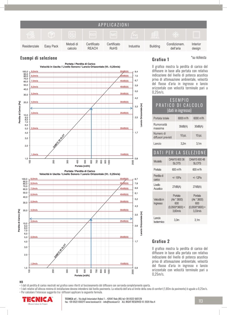• I dati di perdita di carico mostrati nel grafico sono riferiti al funzionamento del diffusore con serranda completamente aperta.