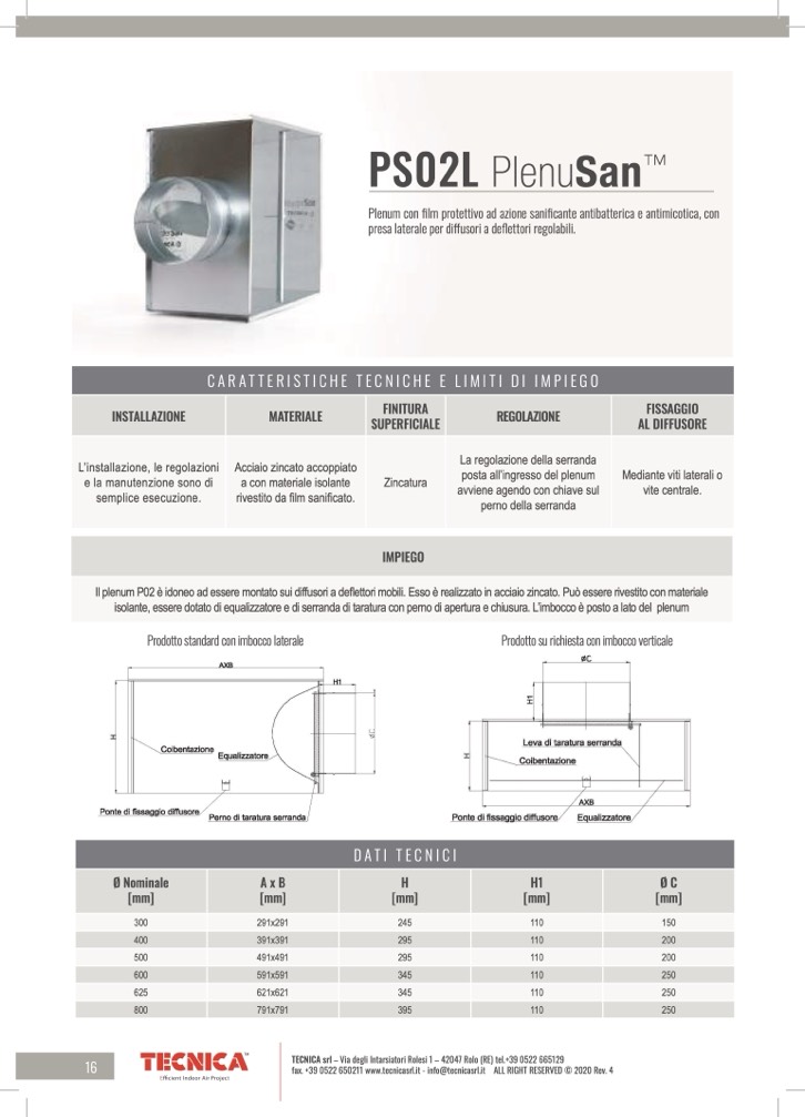 Il plenum P02 è idoneo ad essere montato sui diffusori a deflettori mobili. Esso è realizzato in acciaio zincato. Può essere rivestito con materiale