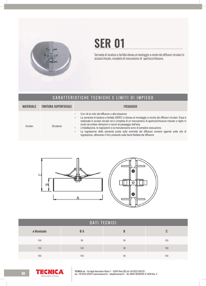 • La serranda di taratura a farfalla SER01 è idonea al montaggio a monte dei diffusori circolari. Essa è