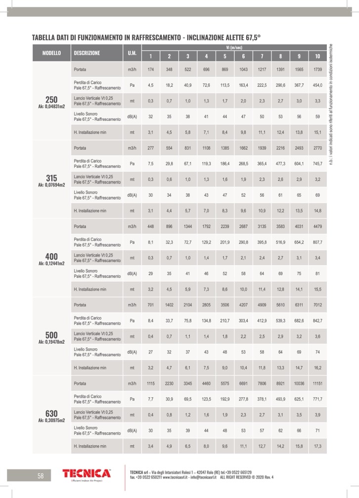 TABELLA DATI DI FUNZIONAMENTO IN RAFFRESCAMENTO - INCLINAZIONE ALETTE 67,5°