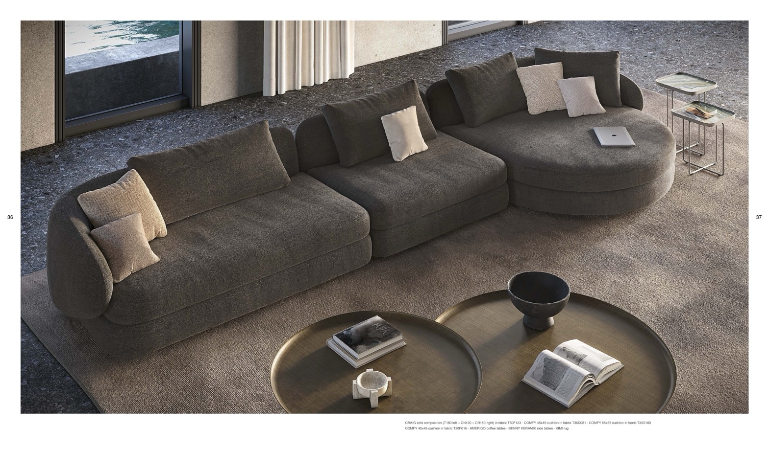 CRAIG sofa composition (T180 left + CN120 + CR160 right) in fabric T50F123 - COMFY 45x45 cushion in fabric T30D081 - COMFY 55x55 cushion in fabric T30D183