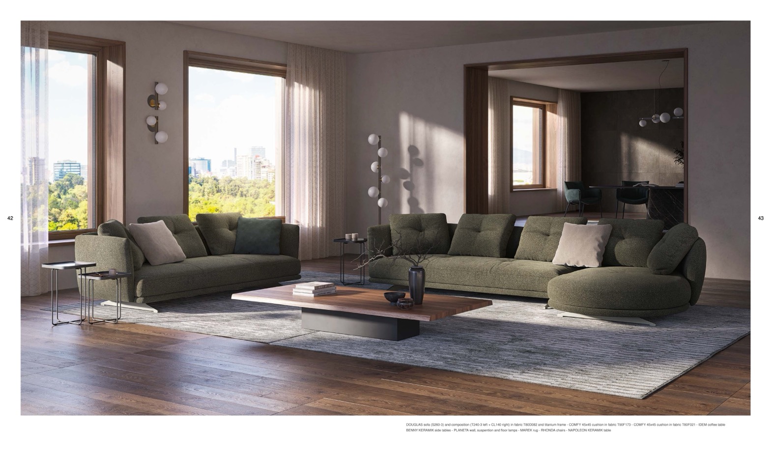 DOUGLAS sofa (S260-3) and composition (T240-3 left + CL140 right) in fabric T80D082 and titanium frame - COMFY 45x45 cushion in fabric T90F173 - COMFY 45x45 cushion in fabric T80F021 - IDEM co