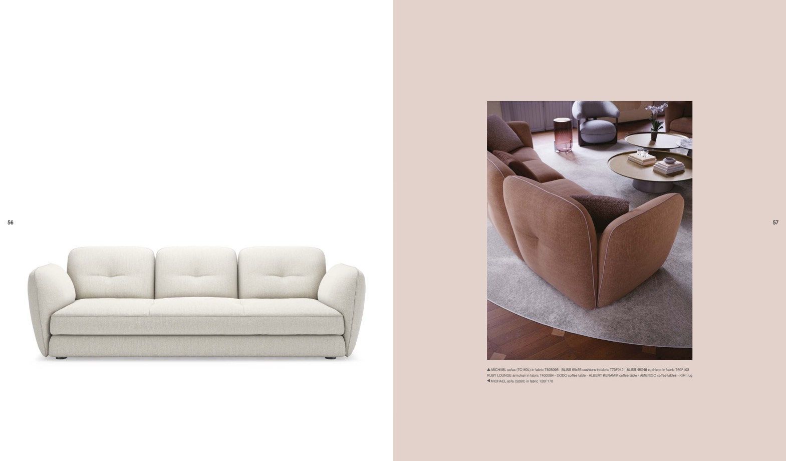 MICHAEL sofas (TC160L) in fabric T60B095 - BLISS 55x55 cushions in fabric T70F012 - BLISS 45X45 cushions in fabric T60F103