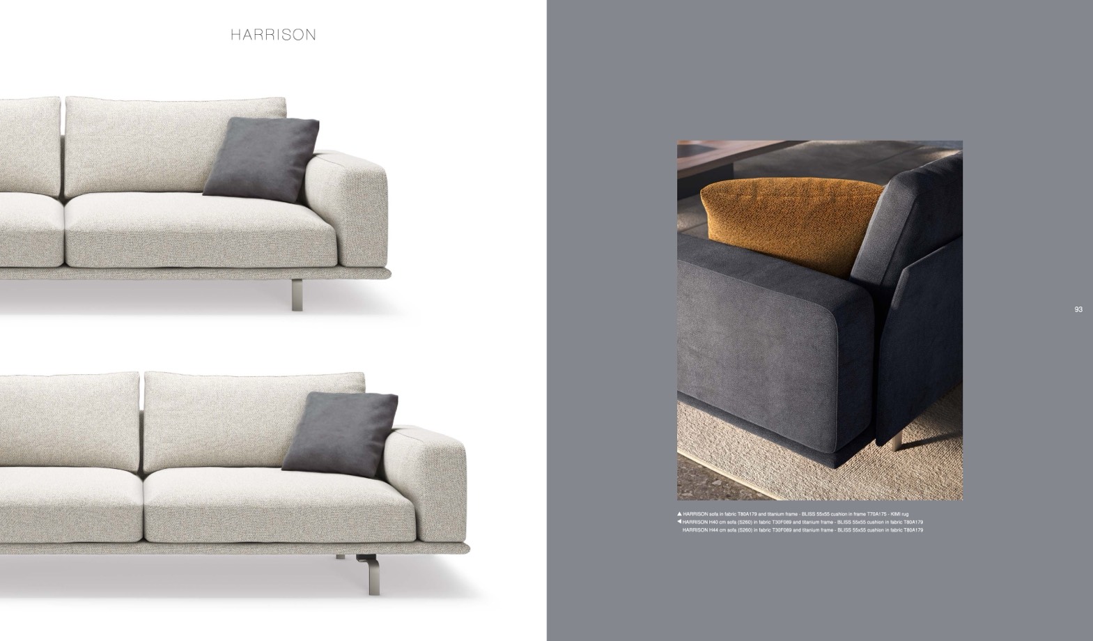 HARRISON sofa in fabric T80A179 and titanium frame - BLISS 55x55 cushion in frame T70A175 - KIMI rug