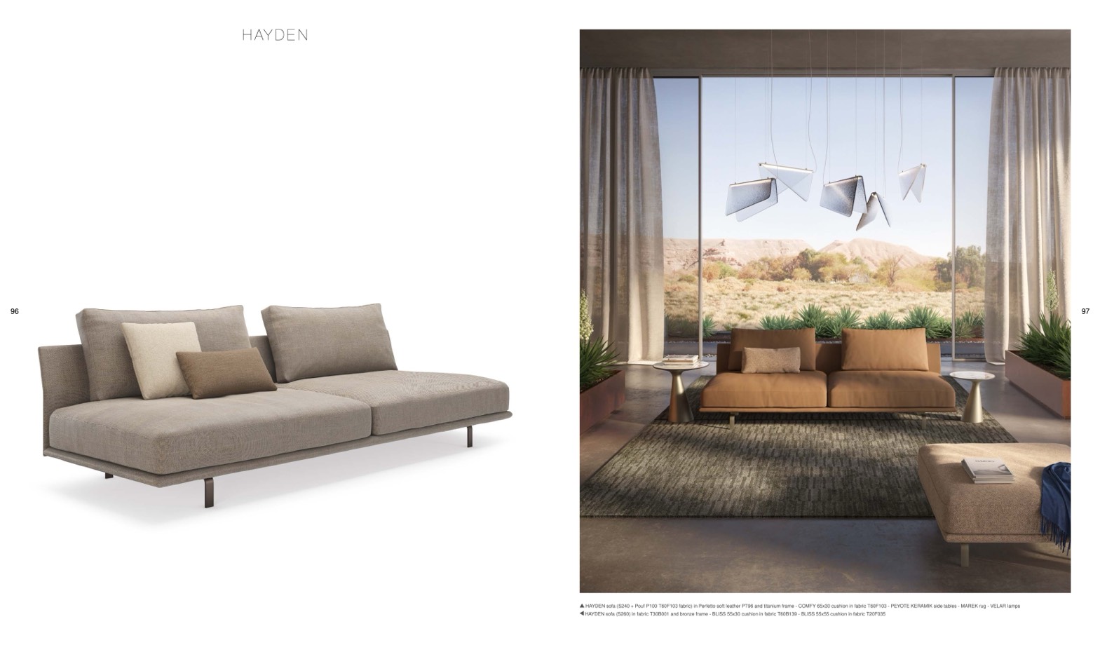 HAYDEN sofa (S240 + Pouf P100 T60F103 fabric) in Perfetto soft leather PT96 and titanium frame - COMFY 65x30 cushion in fabric T60F103 - PEYOTE KERAMIK side tables - MAREK rug - VELAR lamps